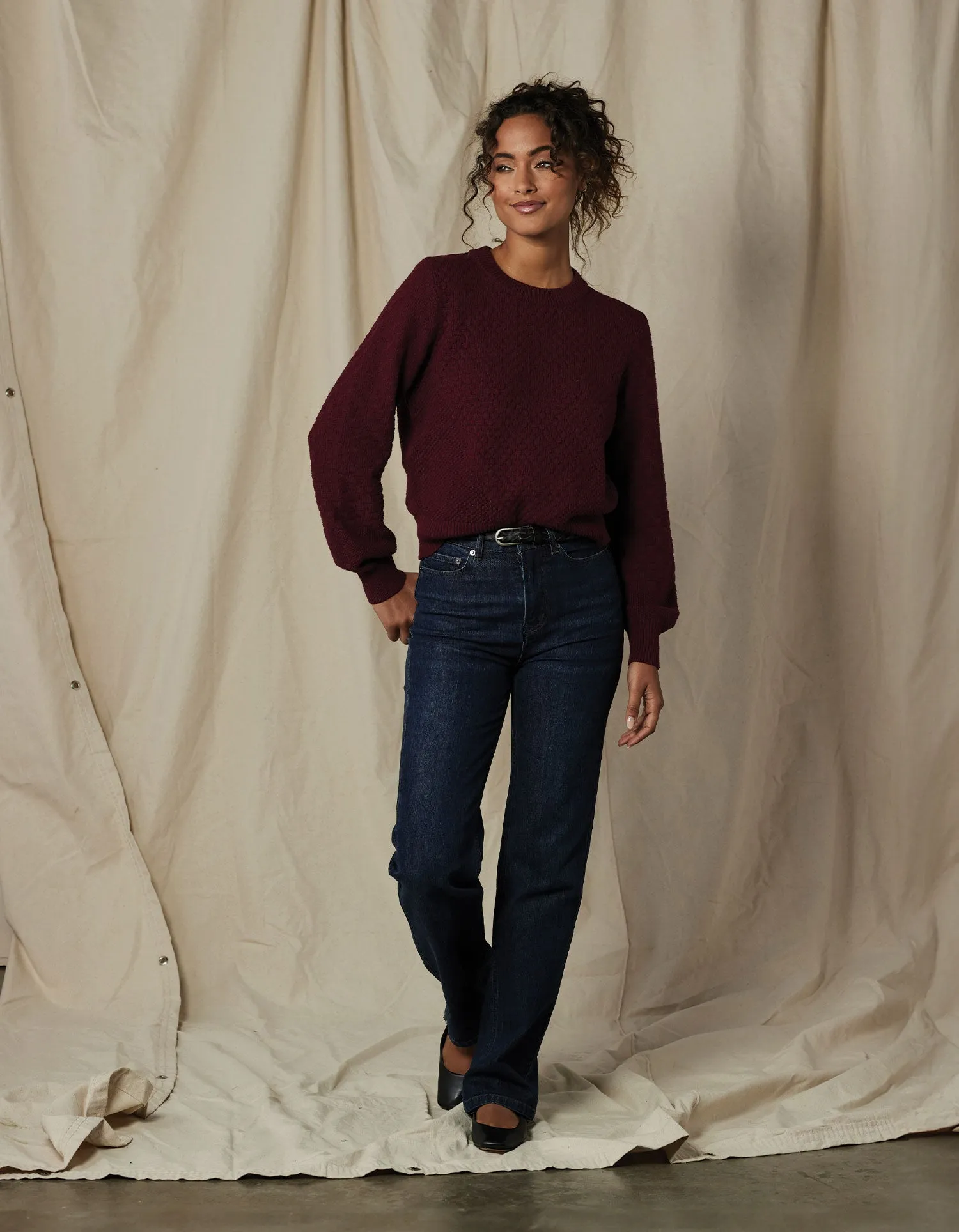 Knit from a 5 gauge chunky, soft textured Cotton, it offers a mid-weight feel perfect for chilly days. It features a relaxed fit that hits at mid-rise and is inspired by Nordic hand-knit sweaters. Novelty stitch patterns include a flattering visual v-design through the body, slight bell sleeves with rib cuffs, and bottom band for feminine, modern details.