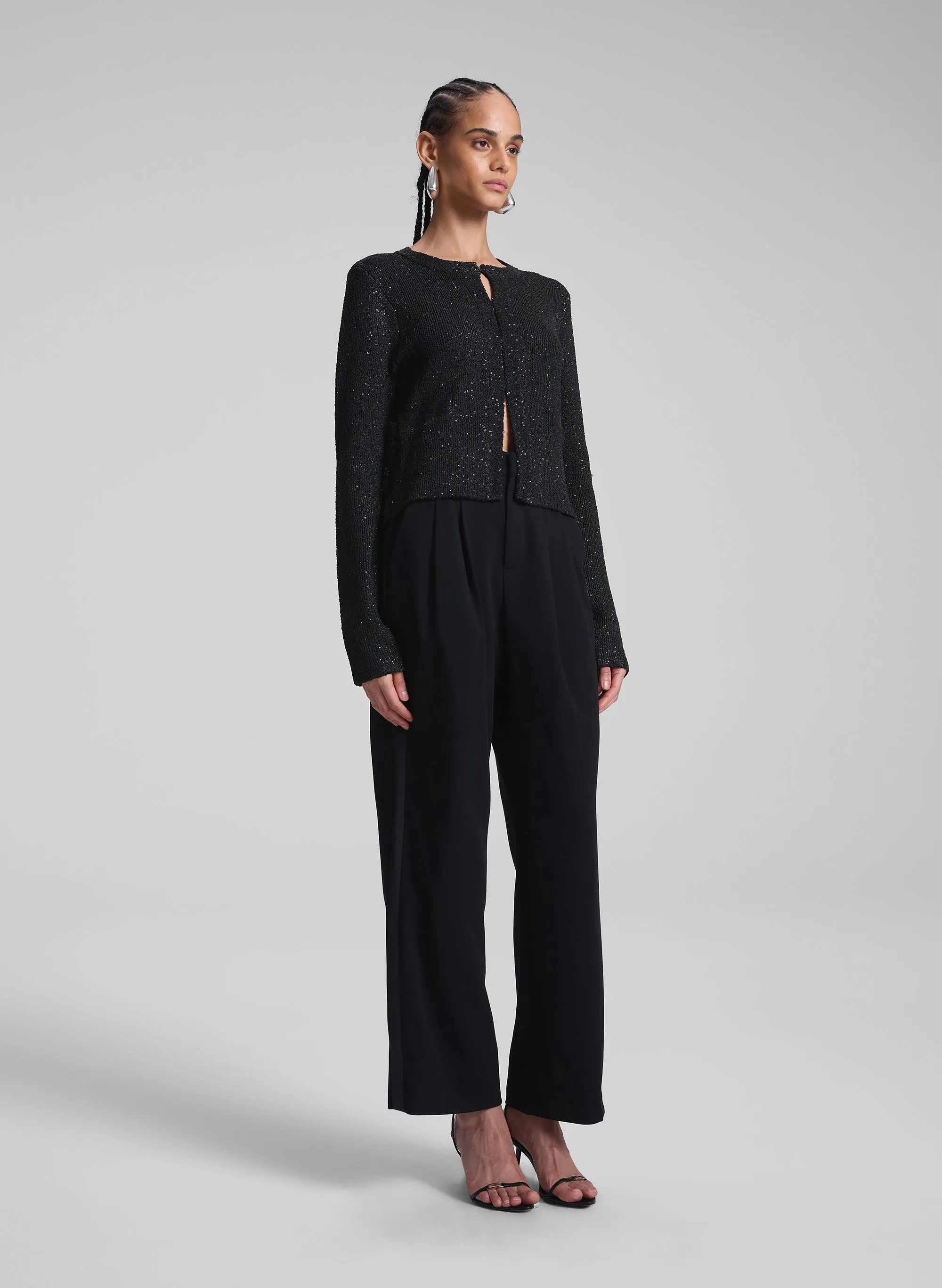 The Meg Cardigan is crafted from our signature compact viscose knit, combined with black all-over sequin yarn for a touch of shimmer. Double-knit trims frame this versatile silhouette, which features hook-and-eye closures that can be fastened at the neckline or worn fully closed as a top.